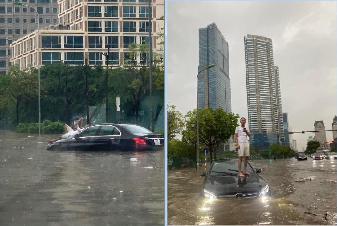 Trong vô số cảnh người dân chia sẻ về trận mưa gây ngập cục bộ chiều qua, đáng chú ý nhất là hình ảnh người đàn ông đứng trên xế hộp Mercedes hơn 2 tỷ để check-in. Xung quanh anh mênh mông nước, mực nước đã ngập qua bánh xe ô tô.