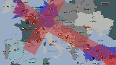 | Bản đồ cho thấy IS âm mưu tấn công châu Âu theo hình chữ thập khổng lồ |