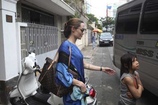 | Angelina Jolie và con trai Pax Thiên trước cửa quán ăn mà gia đình cô đã tới dùng bữa. Ảnh: Na Sơn/AP |