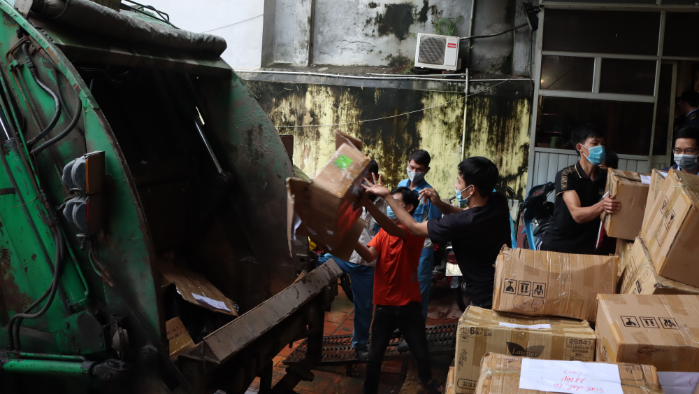 Tại kho hàng thuộc trụ sở Đội QLTT số 14, Cục QLTT Hà Nội sáng ngày 2/11, toàn bộ số hàng hóa nằm trong diện tiêu hủy đã được vận chuyển xuống xe chuyên dụng để di chuyển ra địa điểm tiêu hủy tại xã Đại Đồng, huyện Văn Lâm, tỉnh Hưng Yên dưới sự chứng kiến của ông Vũ Minh Nam – chủ sở hữu của lô hàng và đồng chí Trịnh Quang Đức – Phó Cục trưởng Cục QLTT TP Hà Nội cùng đại diện một số phòng ban trong Cục QLTT TP Hà Nội.