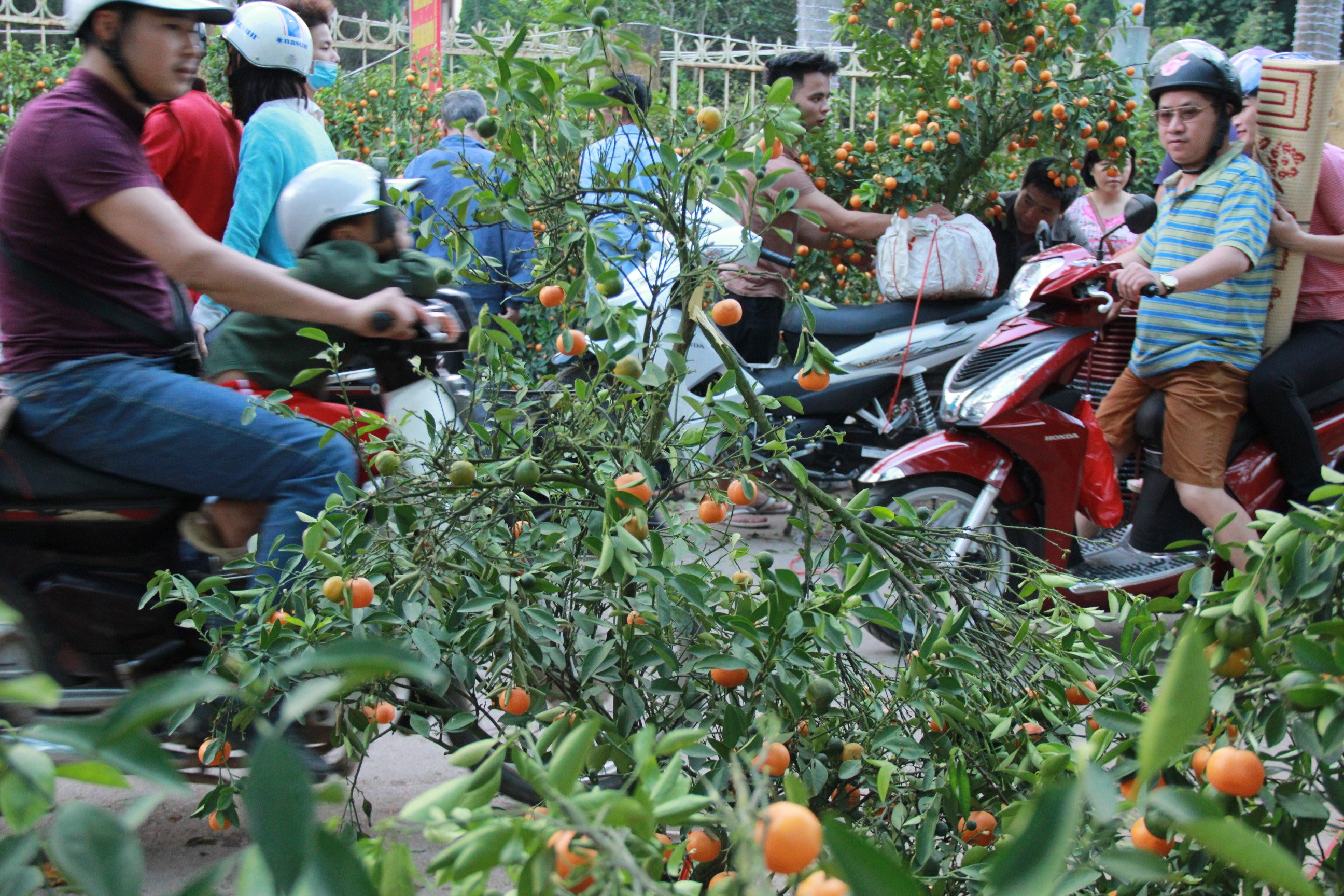 Trong chiều 30 Tết Nguyên Đán (4/2), tại khu vực thị trấn Thường Tín vẫn bạt ngàn quất cảnh, cam canh của các tiểu thương bên Văn Giang (Hưng Yên).