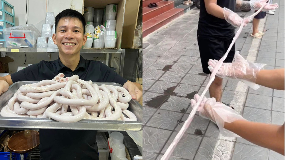 Anh này khẳng định gia đình mình 30 năm kinh nghiệm làm việc với các lò mổ lợn. Lòng xe điếu giá đắt, có thể đến cả triệu đồng một cân và hiếm nên sản phẩm lòng xe điếu dài 40m gần như là không thể có.