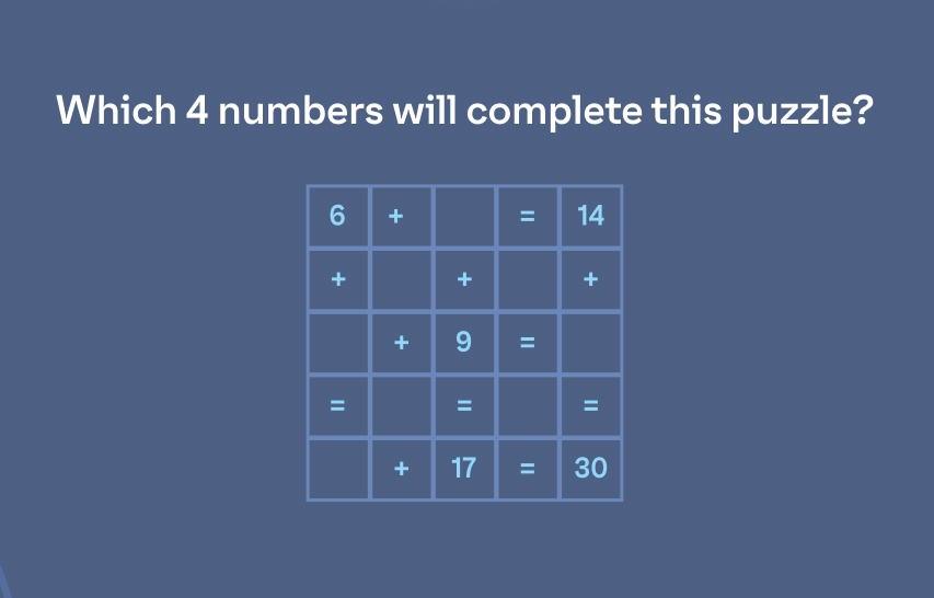 Những phép tính cộng được sắp xếp thành bảng. Theo bạn, 4 số còn thiếu cần điền vào bảng là những số nào?