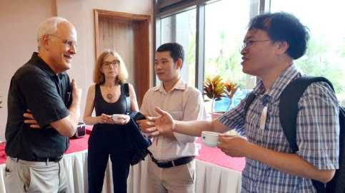 | GS Đàm Thanh Sơn (bìa phải) trao đổi với GS David J.Gross (bìa trái), giải Nobel vật lý năm 2004, bên lề hội nghị Gặp gỡ Việt Nam lần thứ 9, năm 2013 tại TP Quy Nhơn (Bình Định) - Ảnh: Trường Đăng |