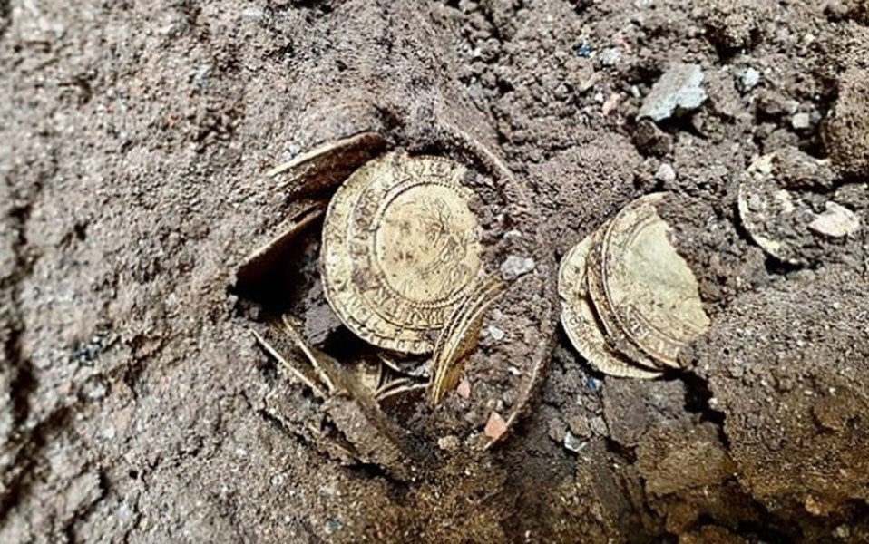 Dùng máy dò kim loại để tìm chìa khóa, 2 người đàn ông tìm thấy một kho báu với 14 đồng tiền xu cổ. (Ảnh: Dailymail)