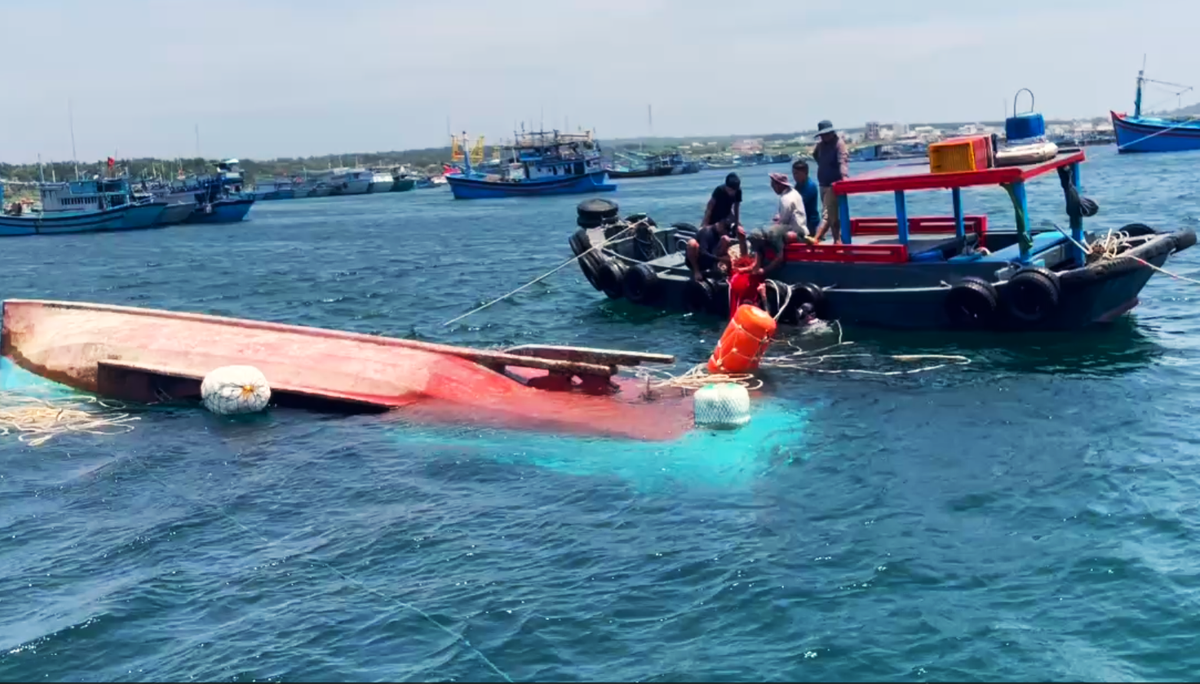 Ngư dân Phú Quý trục vớt thuyền câu lật và tìm kiếm 1 ngư dân mất tích còn lại.