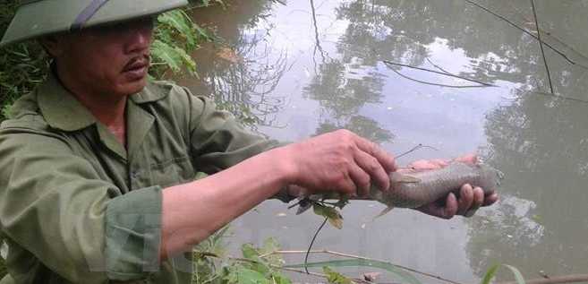 Ngoài cá tự nhiên thì cá trong ao sử dụng nguồn nước từ các suối đầu nguồn cũng chết bất thường. Ảnh VietNamplus