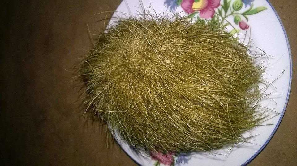 "Nhiều người trong gia đình thấy lạ, nên đã đặt vật lạ vào chiếc đĩa để phơi ngoài nắng cho khô. Khi vật lạ này khô, thì hiện ra một lớp lông vàng óng, mềm mại như tơ.