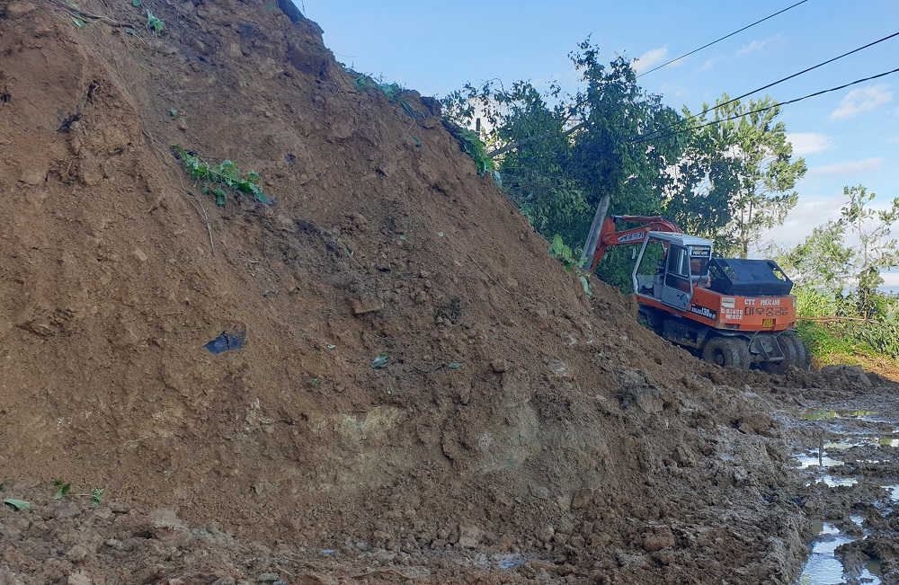 Lực lượng chức năng vẫn đang ra sức xử lý hàng ngàn khối đất đá gây ách tắc đường dẫn lên hiện trường sạt lở.