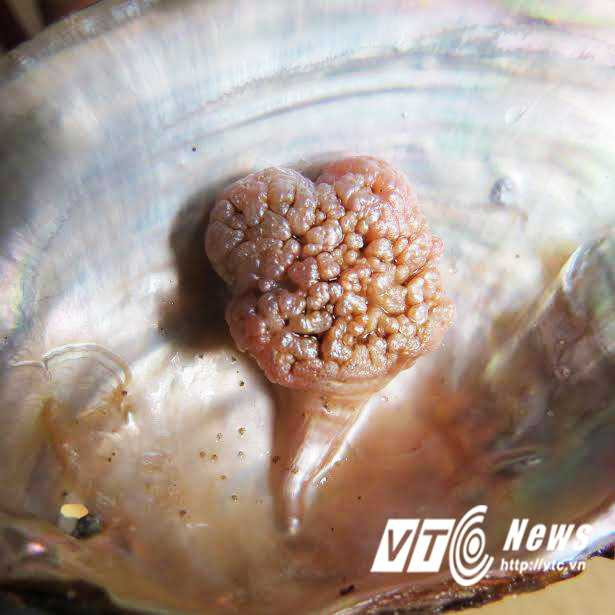 “Lúc mở con trai ra thì tôi phát hiện viên ngọc có hình thù kỳ lạ giống hệt chiếc súp lơ. Nhiều người đến trả tôi hơn 10 triệu nhưng tôi chưa muốn bán”, anh Hùng thông tin. Theo quan sát của PV VTC News, viên ngọc trai nặng gần 100 gram; cao 3 cm và có màu hồng nhạt.