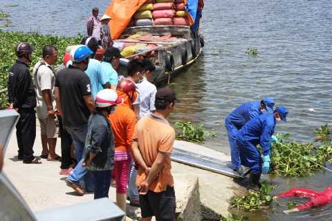 | Lực lượng chức năng vớt xác chị L. lên bờ |