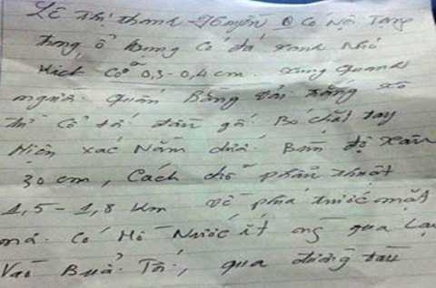Bức thư viết: "Lê Thị Thanh Huyền không có nội tạng trong ổ bụng có đá xanh nhỏ kích cỡ từ 3 - 4 cm xung quanh người quấn bằng vải trắng xô từ cổ tới đầu gối bó chặt tay, hiện xác nằm dưới bùn độ sâu 30 cm cách chỗ phẫu thuật từ 1,5 - 1,8 km về phía trước mặt nơi có hồ nước ít người qua lại vào buổi tối, qua đường tàu".