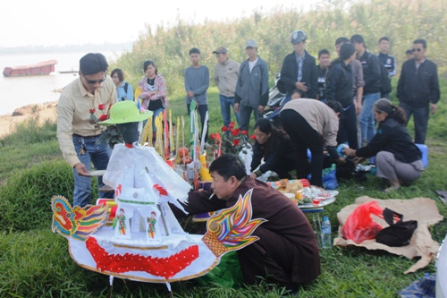 | "Thầy Hùng" làm lễ trên bờ trước khi ném bùa chú xuống sông. Ảnh: Đất Việt |
