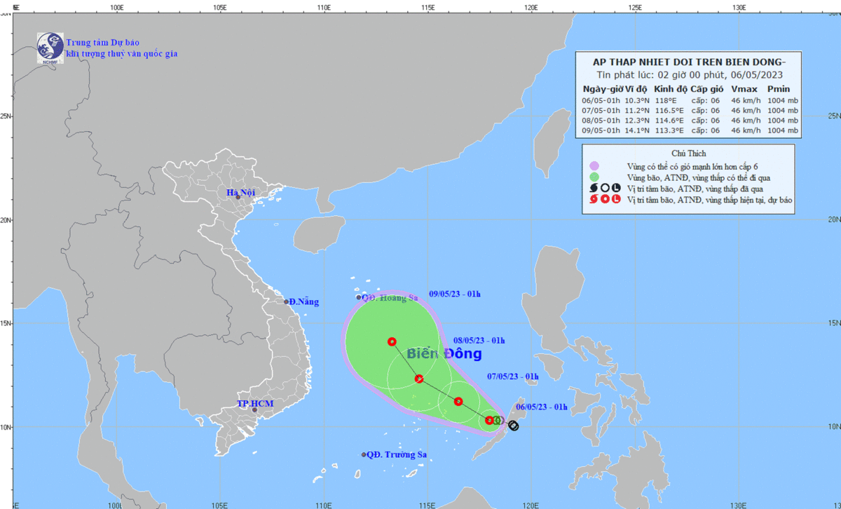 Trung tâm Dự báo khí tượng thủy văn Quốc gia cho biét, lúc 1 giờ 6/5, vị trí tâm áp thấp nhiệt đới (ATNĐ) ở vào khoảng 10,3 độ Vĩ Bắc; 118,0 độ Kinh Đông, cách đảo Song Tử Tây khoảng 430km về phía Đông Đông Nam. Sức gió mạnh nhất vùng gần tâm áp thấp nhiệt đới mạnh cấp 6 (39-49km/giờ), giật cấp 8.