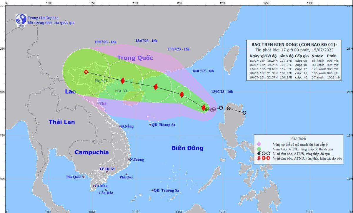 Theo bản tin, hồi 16 giờ ngày 15/7, vị trí tâm bão số 1 ở vào khoảng 18,2 độ Vĩ Bắc; 117,8 độ Kinh Đông, cách bán đảo Lôi Châu (Trung Quốc) khoảng 850km về phía Đông Đông Nam. Sức gió mạnh nhất vùng gần tâm bão mạnh cấp 8 (62-74km/giờ), giật cấp 10.