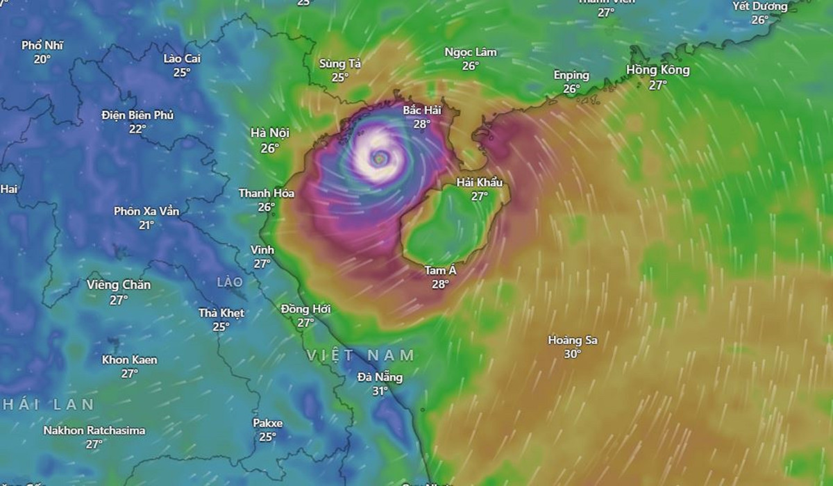 Đến 6h, vị trí tâm bão khoảng 20.4 độ Vĩ Bắc; 108.3 độ Kinh Đông, cách bờ biển Quảng Ninh – Hải Phòng 160km. Sức gió mạnh nhất cấp 14 (150-166km/h), giật cấp 17.