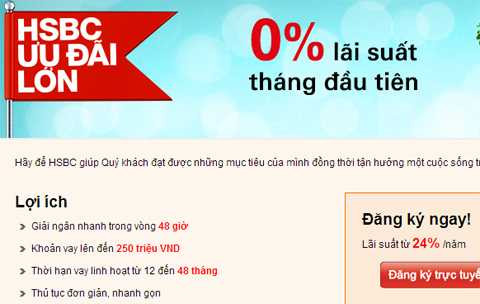 Ngân hàng HSBC có chương trình “HSBC ưu đãi lớn”. Theo đó, khách hàng sẽ được hưởng lãi suất 0% trong tháng đầu tiên. Khách hàng rất dễ tiếp cận với chương trình này vì HSBC sử dụng chính sách thủ tục đơn giản, nhanh gọn; không cần tài sản thế chấp hay bảo lãnh của công ty; giải ngân nhanh trong vòng 48 tiếng; thời gian cho vay lên tới 48 tháng.