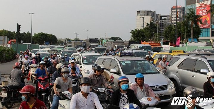 Còn ở TP.HCM, dù lực lượng CSGT có mặt từ sớm để điều tiết giao thông nhưng đoạn đường dẫn vào sân bay Tân Sơn Nhất bị "tê liệt" nhanh chóng do dòng người quá đông . (Ảnh: Hồng Nhân)