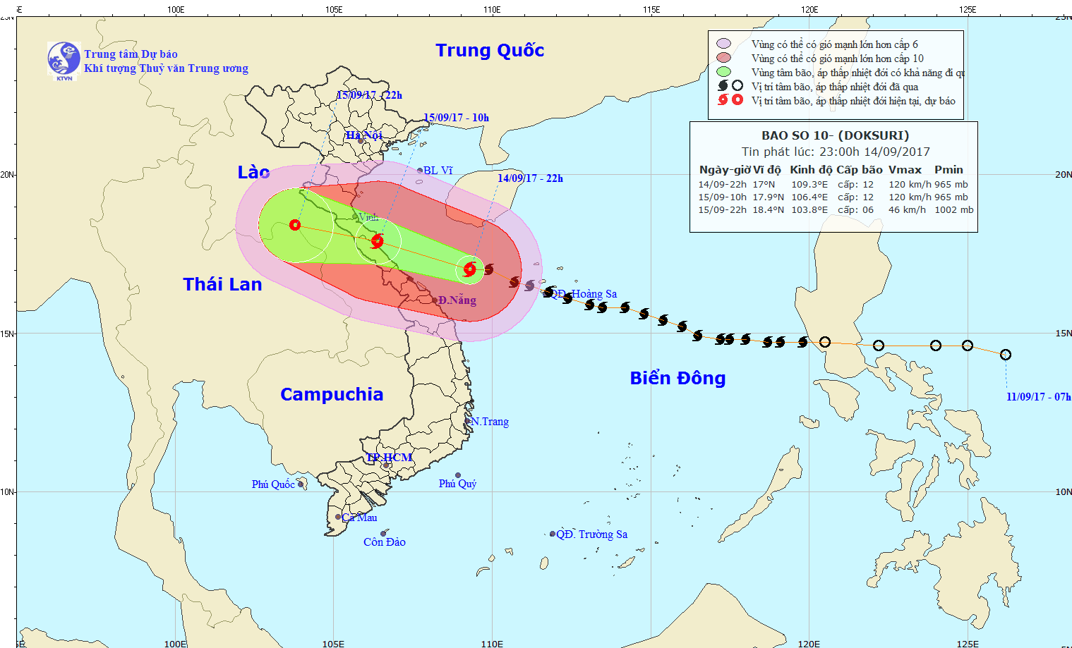 Hồi 22 giờ ngày 14/09, vị trí tâm bão ở vào khoảng 17,0 độ Vĩ Bắc; 109,3 độ Kinh Đông, cách bờ biển các tỉnh từ Hà Tĩnh đến Quảng Bình khoảng 310km về phía Đông Đông Nam. Sức gió mạnh nhất ở vùng gần tâm bão mạnh cấp 12 (115 đến 135 km/giờ), giật cấp 15.