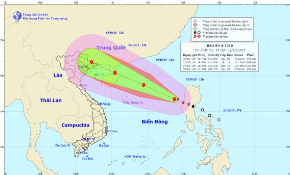 Thông tin mới nhất từ Trung tâm Dự báo Khí tượng Thủy văn Trung ương, vào hồi 16 giờ ngày 2/10, vị trí tâm bão số 4 ở vào khoảng 16,9 độ vĩ Bắc; 118,3 độ kinh Đông, cách quần đảo Hoàng Sa khoảng 660km về phía Đông.