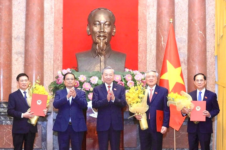 Tổng Bí thư, Chủ tịch nước Tô Lâm trao quyết định bổ nhiệm, Thủ tướng Phạm Minh Chính tặng hoa chúc mừng các Phó Thủ tướng: Nguyễn Hòa Bình, Bùi Thanh Sơn và Hồ Đức Phớc. (Ảnh: TTXVN)