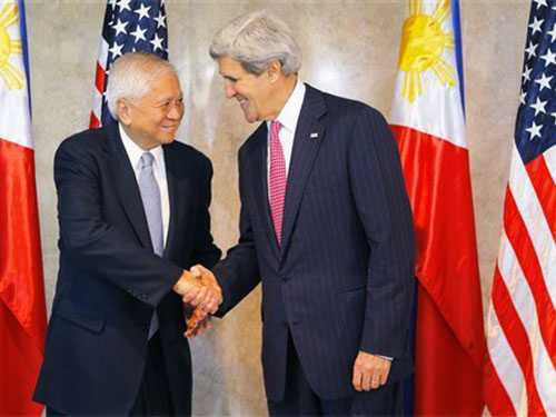 | Ngoại trưởng Philippines Albert del Rosario (trái) tiếp người đồng cấp Mỹ John Kerry hôm 17/12 |