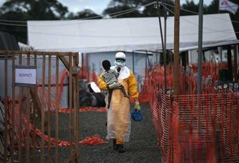 | Một nhân viên y tế bế bé trai nhiễm Ebola đi vào trung tâm điều tị tại Liberia |