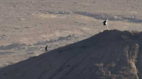 | Phiến quân IS cắm cờ đen trên một con đồi ở thị trấn chiến lược Kobane, sát biên giới Thổ Nhĩ Kỳ |