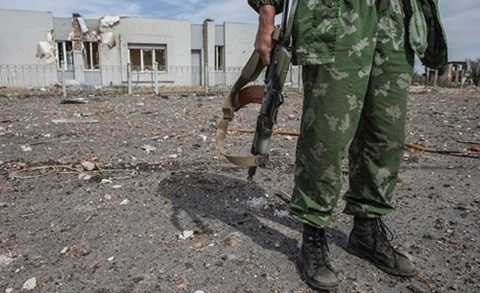 | Một dân quân tự vệ phe ly khai Ukraine đứng gác bên ngoài tòa nhà bị hư hại nghiêm trọng trong các vụ giao tranh |