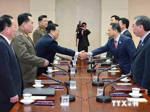 | Quang cảnh cuộc đối thoại cấp cao giữa Triều Tiên và Hàn Quốc tại làng đình chiến Panmunjom hồi tháng 2/2014 |