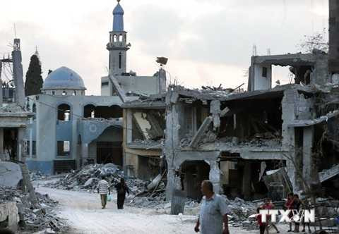| Nhiều ngôi nhà bị phá hủy trong các vụ không kích của Israel tại thành phố Beit Hanun, phía bắc Dải Gaza ngày 18/8 |