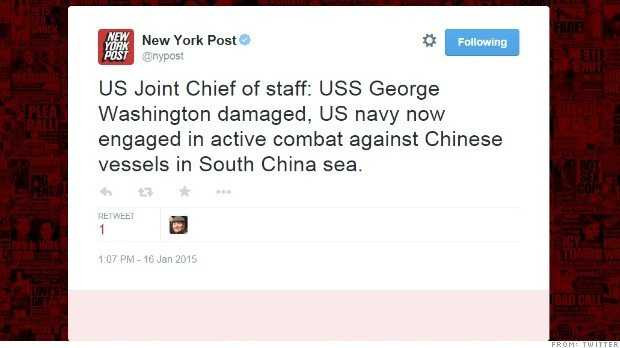 Theo CNN, khoảng 1g trưa ngày 16/1 (rạng sáng 17/1 giờ VN) tài khoản Twitter của cả hai cơ quan truyền thông đều chạy các dòng tin nói rằng quân đội Trung Quốc đã bắn tên lửa vào hàng không mẫu hạm Mỹ và một trận chiến đã nổ ra.