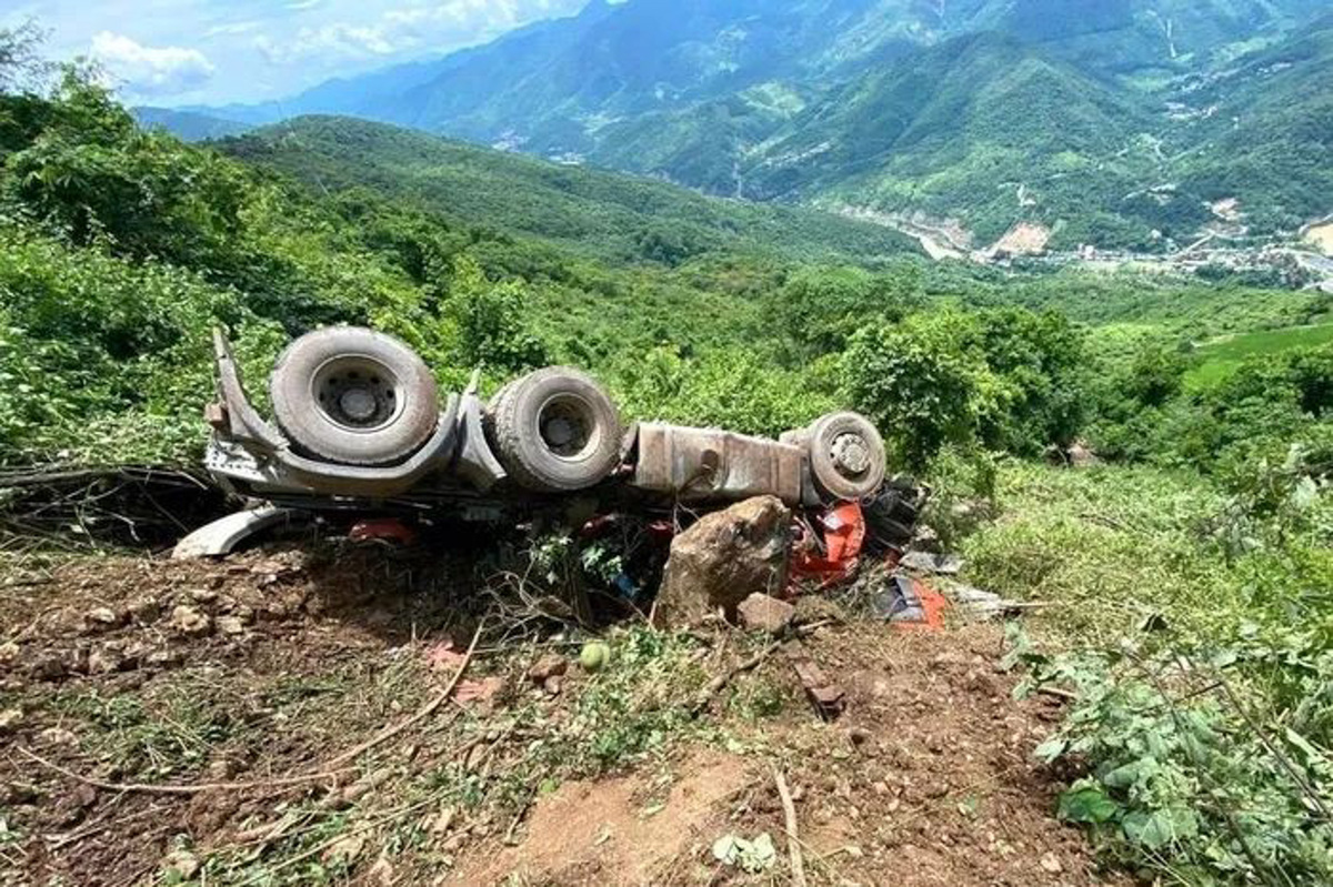 Tại hiện trường, phần đầu xe nằm dưới vực cách mặt đường khoảng gần 100m, cabin bị biến dạng hoàn toàn, anh T. mắc kẹt bên trong và tử vong. Phần thùng xe chứa quặng bị văng xuống vực cách đường khoảng 120m.