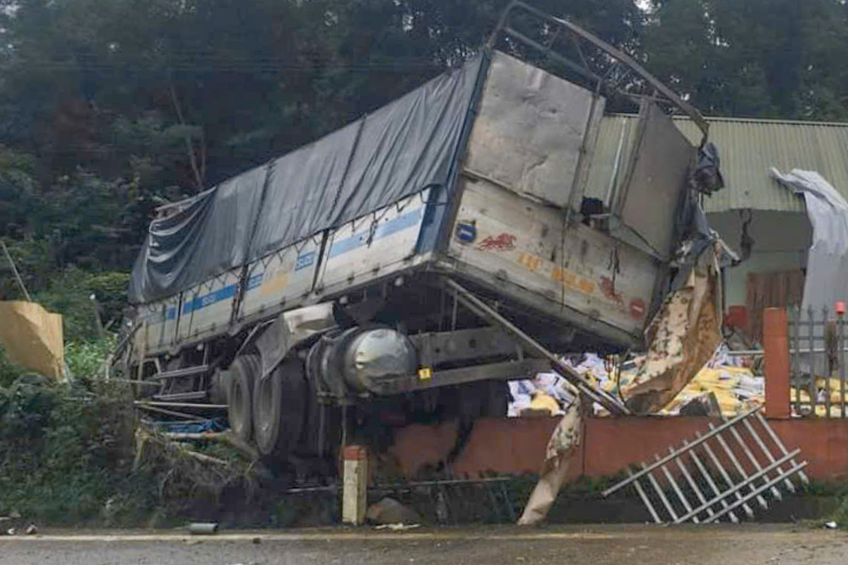 Khi đến đoạn đường thuộc khu vực thị trấn Vân Tùng, ô tô bất ngờ đâm vào lề đường, tường rào và 3 ngôi nhà của người dân bên đường.