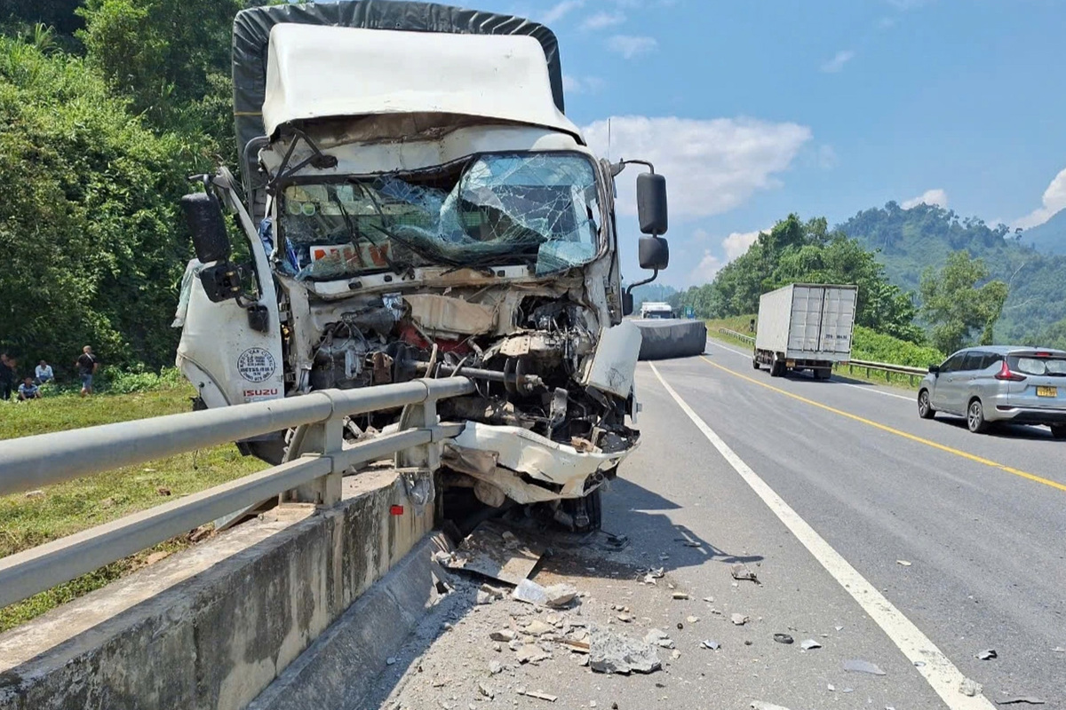 Va chạm mạnh khiến xe tải biển kiểm soát 89H-027.00 lật nằm chắn ngang đường, còn xe 34C-231.94 lao vào hộ lan khiến phần đầu hư hỏng nặng.