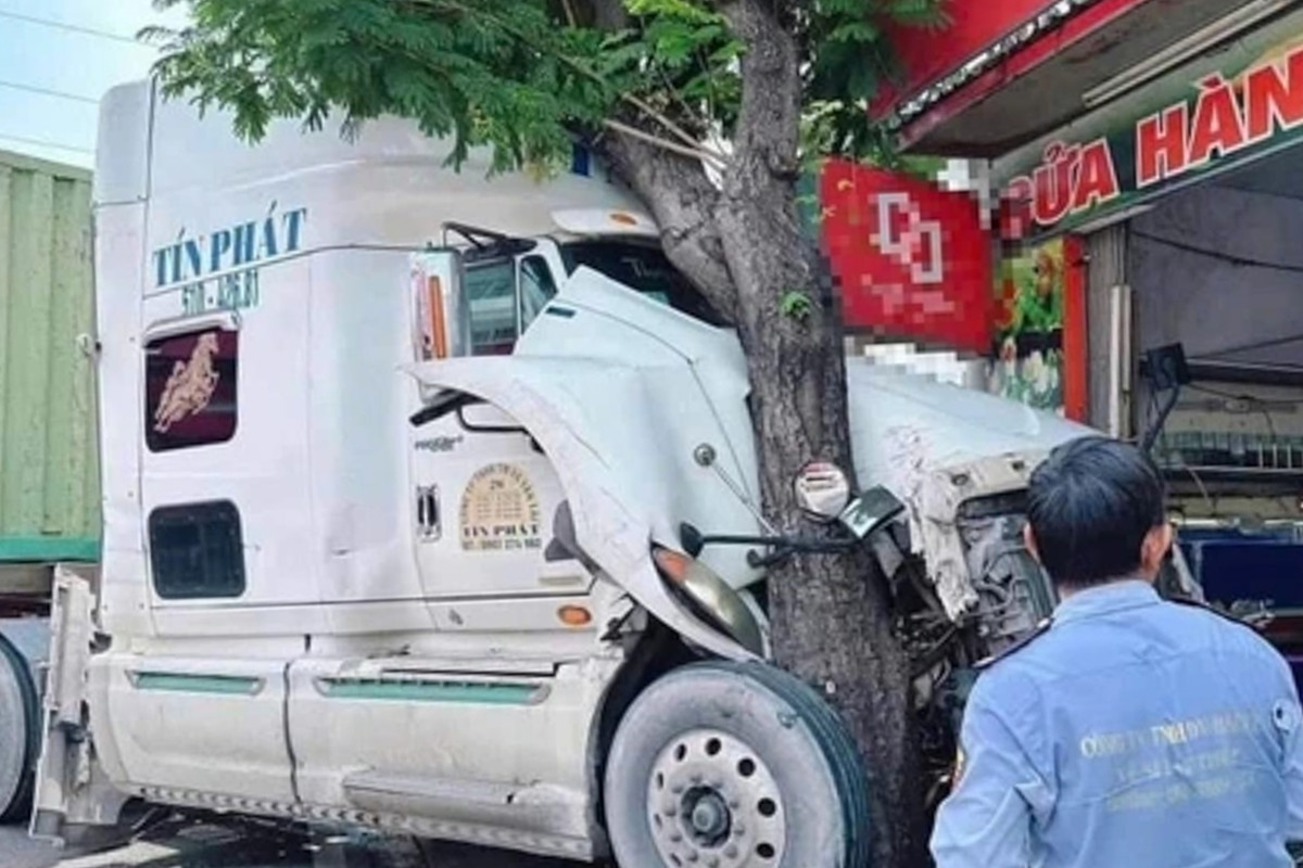 Xe container còn tiếp tục lao qua hướng ngược lại, chạy lên vỉa hè rồi tông thẳng vào góc cây xanh và mái hiên của cửa hàng cá cảnh ở số 51 Nguyễn Thị Thập.