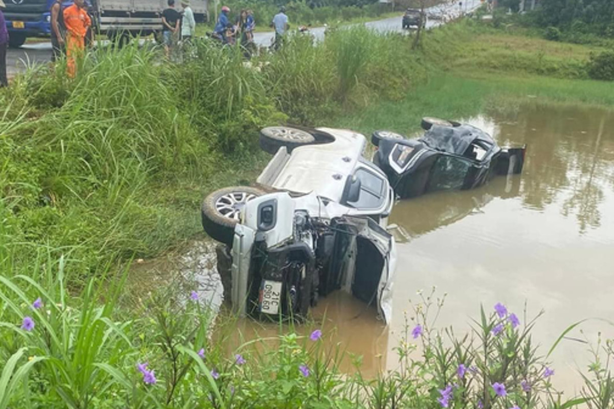 Sau cú va chạm, hai ô tô đều lật xuống ao và bị biến dạng. Khi này, trên xe bán tải có một người và xe 5 chỗ có 4 người.