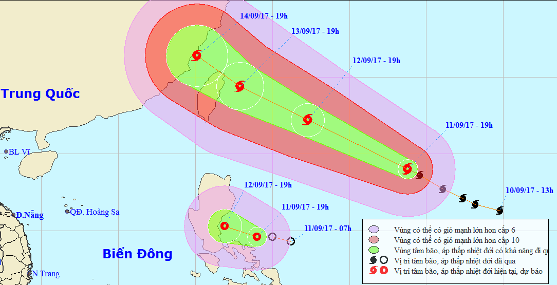 Đến 19h ngày 12/9, vị trí tâm bão ở vào khoảng 22,2 độ Vĩ Bắc; 127,3 độ Kinh Đông, cách đảo Đài Loan (Trung Quốc) khoảng 680km về phía Đông Đông Nam. Sức gió mạnh nhất ở vùng gần tâm bão mạnh cấp 14-15 (150 đến 185 km/giờ), giật trên cấp 17.
