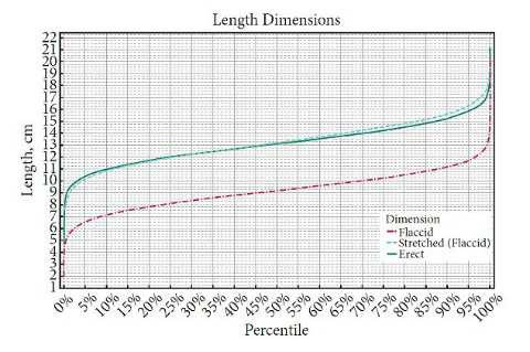| Biểu đồ trên cho thấy chiều dài trung bình dương vật của nam giới - theo cm - trong mỗi phần trăm. |