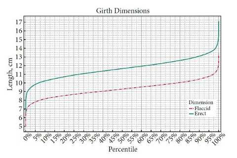 | Biểu đồ trên cho thấy chu vi trung bình dương vật của nam giới - theo cm - trong mỗi phần trăm. |