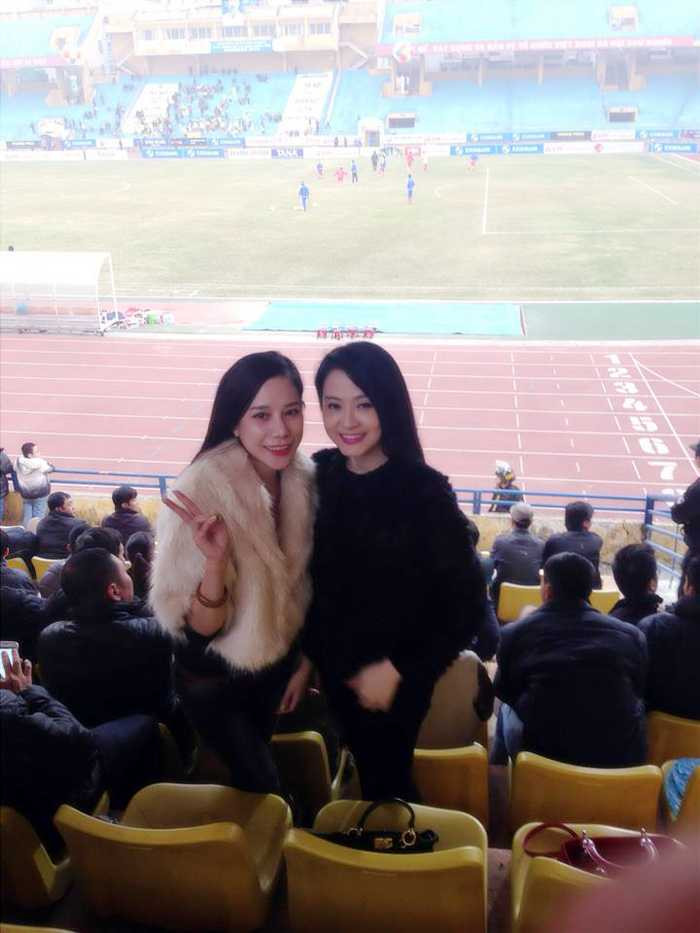 Trà My và bạn tới sân Hàng Đẫy có vũ cho Tiến Thành ở ngày khai mạc giải V-League 2014.