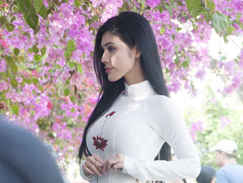 Tuy sở hữu vẻ đẹp gợi cảm và được ví như 'bông hồng lai' nhưng Maria Đinh Phương Ánh khi khoác lên mình tà áo dài vẫn vô cùng dịu dàng và xinh đẹp.