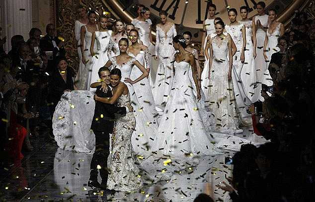 Siêu mẫu người Nga tự tin sải bước catwalk với chiếc váy cưới của nhãn Pronovias.