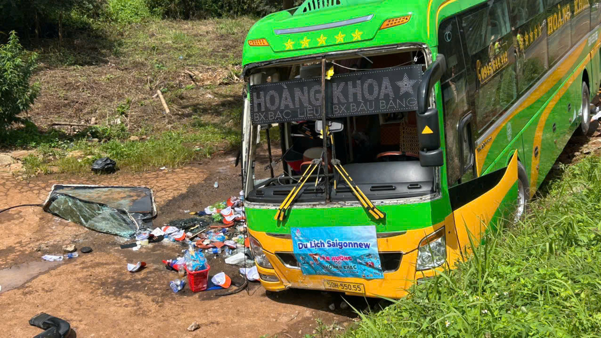 Đến Km1714+100 đường Hồ Chí Minh khi vào đoạn đường cong cua, do thiếu chú ý quan sát làm xe khách lật nghiêng về bên phải khiến nhiều người bị thương.