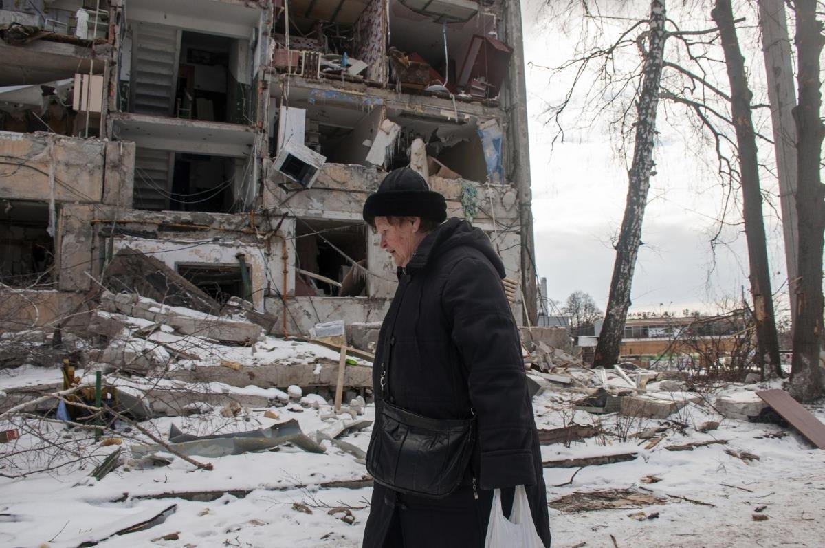 Một phụ nữ đi qua tòa nhà trúng đạn pháo kích ở Kharkov, miền Đông Ukraine. (Ảnh: AP)