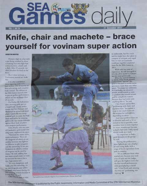 (VTC News)- "Dao, ghế và mã tấu- hãy thử sức mình với những pha siêu hành động của Vovinam". Đó là dòng tít gây ấn tượng ở trang nhất từ nhật báo SEA Games phiên bản tiếng Anh hôm qua.