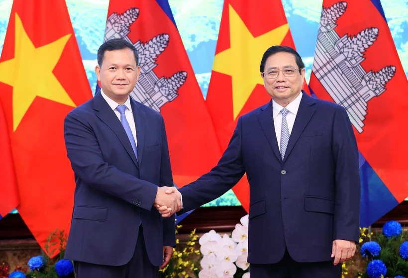 Thủ tướng Campuchia Samdech Hun Manet và Thủ tướng Phạm Minh Chính. (Ảnh: TTXVN)