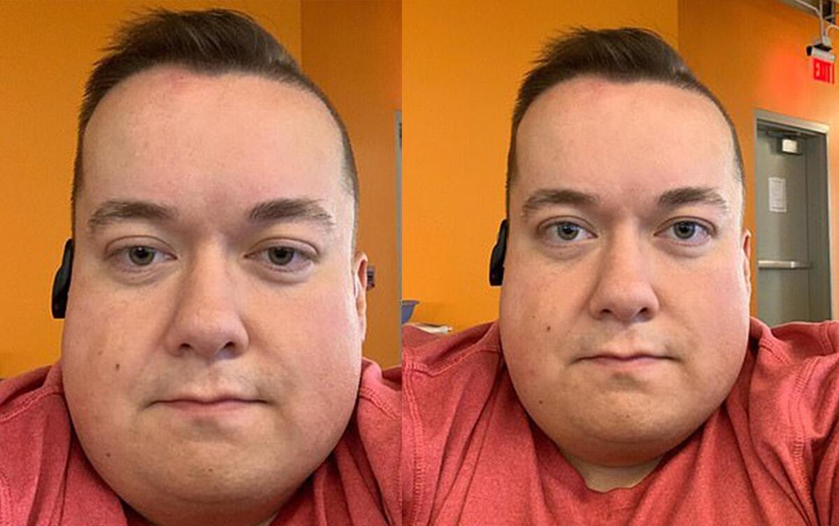 Hình ảnh người dùng trong cuộc gọi Facetime khi tắt (trái) và bật tuỳ chọn (phải) "Giao tiếp bằng mắt". (Ảnh: Will Sig)
