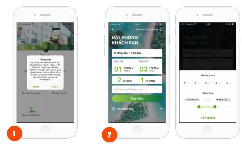 Bên cạnh các giao dịch tài chính, Vietcombank cũng đồng thời chú trọng phát triển những tính năng gia tăng để khách hàng trải nghiệm các tiện ích mới trong cuộc sống. Chỉ với ứng dụng VCB-Mobile B@nking, khách hàng ngoài việc có thể đặt vé xem phim, đặt vé máy bay, nay đã có thể đặt phòng khách sạn. Với tiện ích Đặt phòng khách sạn, hệ thống Ngân hàng di động sẽ giúp khách hàng chọn lựa và thanh toán phòng khách sạn tiện lợi hơn, nhanh chóng hơn và an toàn hơn chỉ với vài thao tác đơn giản.