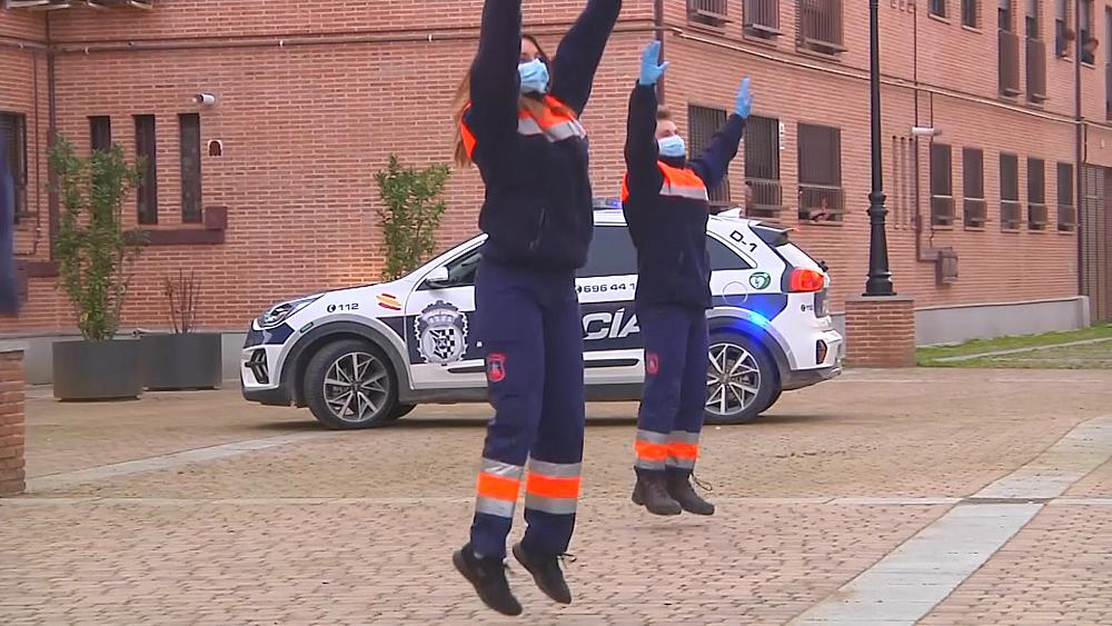 Đây là cách các tình nguyện viên của lực lượng Bảo vệ dân sự Tây Ban Nha cổ vũ cư dân tại một thị trấn nhỏ ngay bên ngoài thủ đô Madrid.